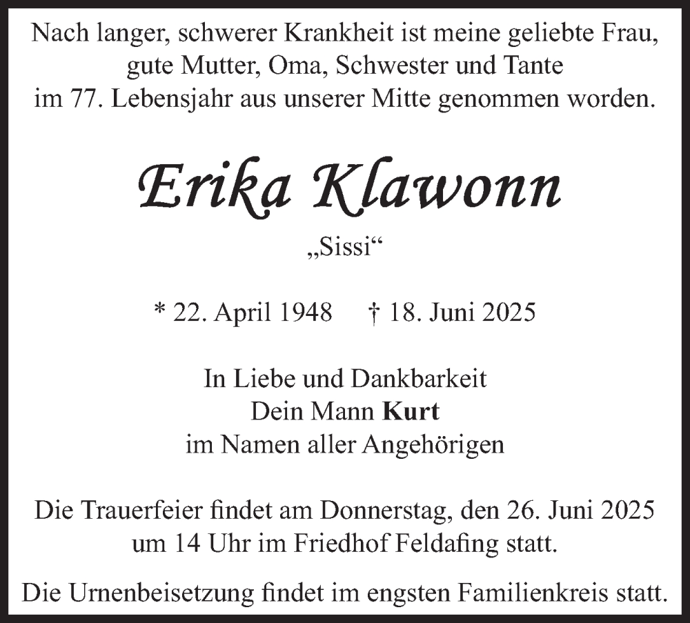 Hier finden Sie alle Traueranzeigen aus der Zeitung, die bisher für Erika Klawonn erschienen sind. Weitere Traueranzeigen, die in der Zeitung erscheinen, werden hier ebenfalls aufgelistet