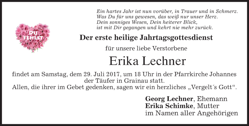 Hier finden Sie alle Traueranzeigen aus der Zeitung, die bisher für Erika Lechner erschienen sind. Weitere Traueranzeigen, die in der Zeitung erscheinen, werden hier ebenfalls aufgelistet