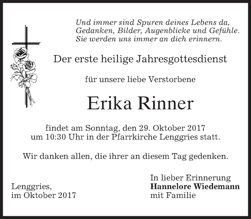 Hier finden Sie alle Traueranzeigen aus der Zeitung, die bisher für Erika Rinner erschienen sind. Weitere Traueranzeigen, die in der Zeitung erscheinen, werden hier ebenfalls aufgelistet