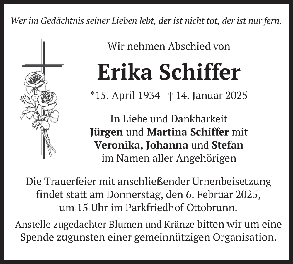 Hier finden Sie alle Traueranzeigen aus der Zeitung, die bisher für Erika Schiffer erschienen sind. Weitere Traueranzeigen, die in der Zeitung erscheinen, werden hier ebenfalls aufgelistet