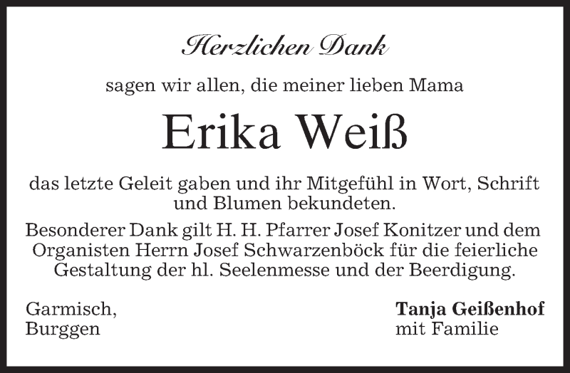 Hier finden Sie alle Traueranzeigen aus der Zeitung, die bisher für Erika Weiß erschienen sind. Weitere Traueranzeigen, die in der Zeitung erscheinen, werden hier ebenfalls aufgelistet