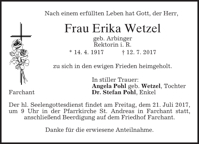 Hier finden Sie alle Traueranzeigen aus der Zeitung, die bisher für Erika Wetzel erschienen sind. Weitere Traueranzeigen, die in der Zeitung erscheinen, werden hier ebenfalls aufgelistet