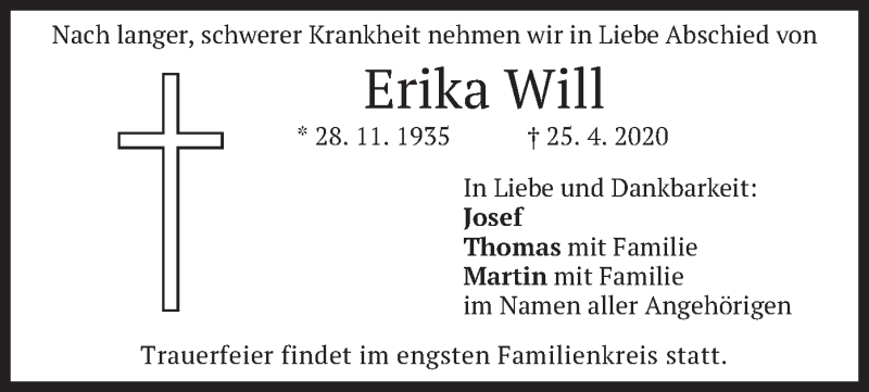Hier finden Sie alle Traueranzeigen aus der Zeitung, die bisher für Erika Will erschienen sind. Weitere Traueranzeigen, die in der Zeitung erscheinen, werden hier ebenfalls aufgelistet