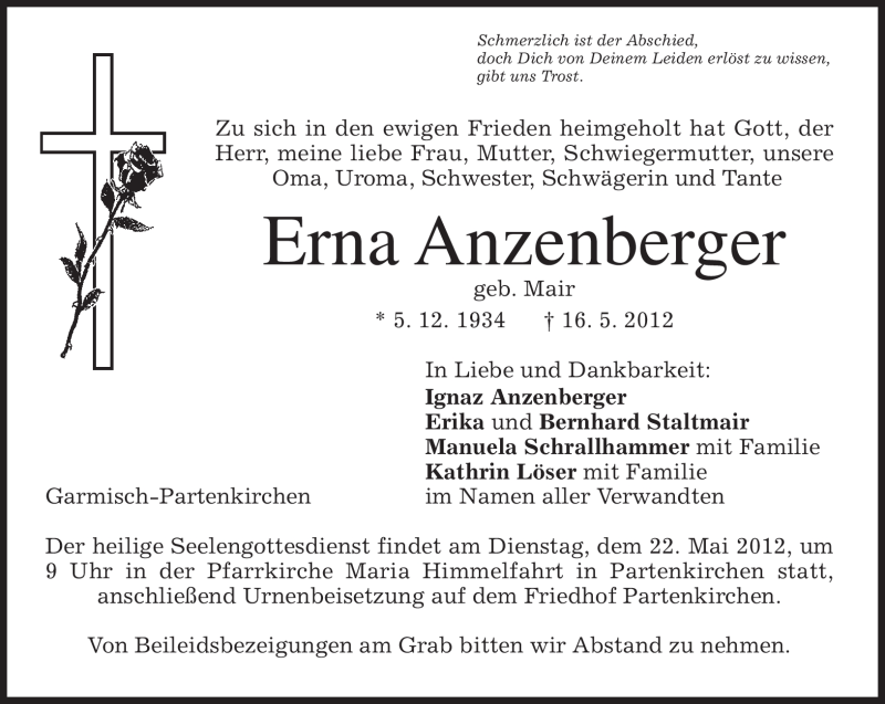 Hier finden Sie alle Traueranzeigen aus der Zeitung, die bisher für Erna Anzenberger erschienen sind. Weitere Traueranzeigen, die in der Zeitung erscheinen, werden hier ebenfalls aufgelistet