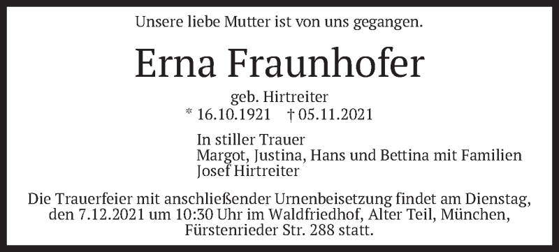 Hier finden Sie alle Traueranzeigen aus der Zeitung, die bisher für Erna Fraunhofer erschienen sind. Weitere Traueranzeigen, die in der Zeitung erscheinen, werden hier ebenfalls aufgelistet