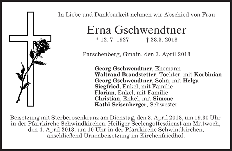 Hier finden Sie alle Traueranzeigen aus der Zeitung, die bisher für Erna Gschwendtner erschienen sind. Weitere Traueranzeigen, die in der Zeitung erscheinen, werden hier ebenfalls aufgelistet