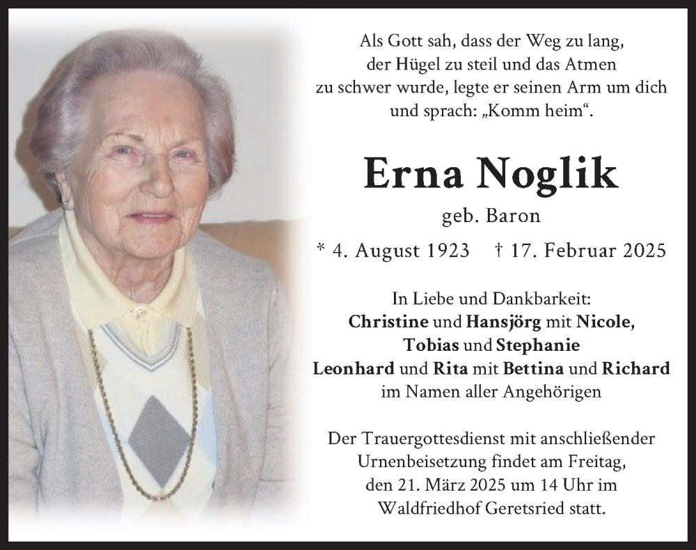 Hier finden Sie alle Traueranzeigen aus der Zeitung, die bisher für Erna Noglik erschienen sind. Weitere Traueranzeigen, die in der Zeitung erscheinen, werden hier ebenfalls aufgelistet