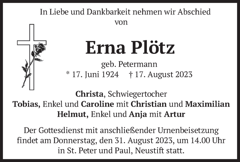 Hier finden Sie alle Traueranzeigen aus der Zeitung, die bisher für Erna Plötz erschienen sind. Weitere Traueranzeigen, die in der Zeitung erscheinen, werden hier ebenfalls aufgelistet
