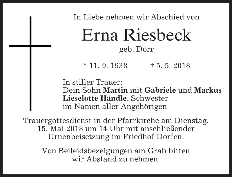 Hier finden Sie alle Traueranzeigen aus der Zeitung, die bisher für Erna Riesbeck erschienen sind. Weitere Traueranzeigen, die in der Zeitung erscheinen, werden hier ebenfalls aufgelistet