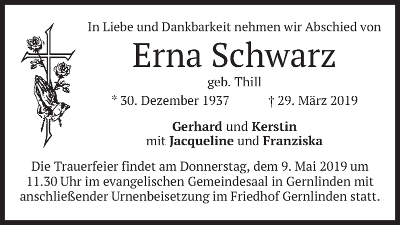 Hier finden Sie alle Traueranzeigen aus der Zeitung, die bisher für Erna Schwarz erschienen sind. Weitere Traueranzeigen, die in der Zeitung erscheinen, werden hier ebenfalls aufgelistet