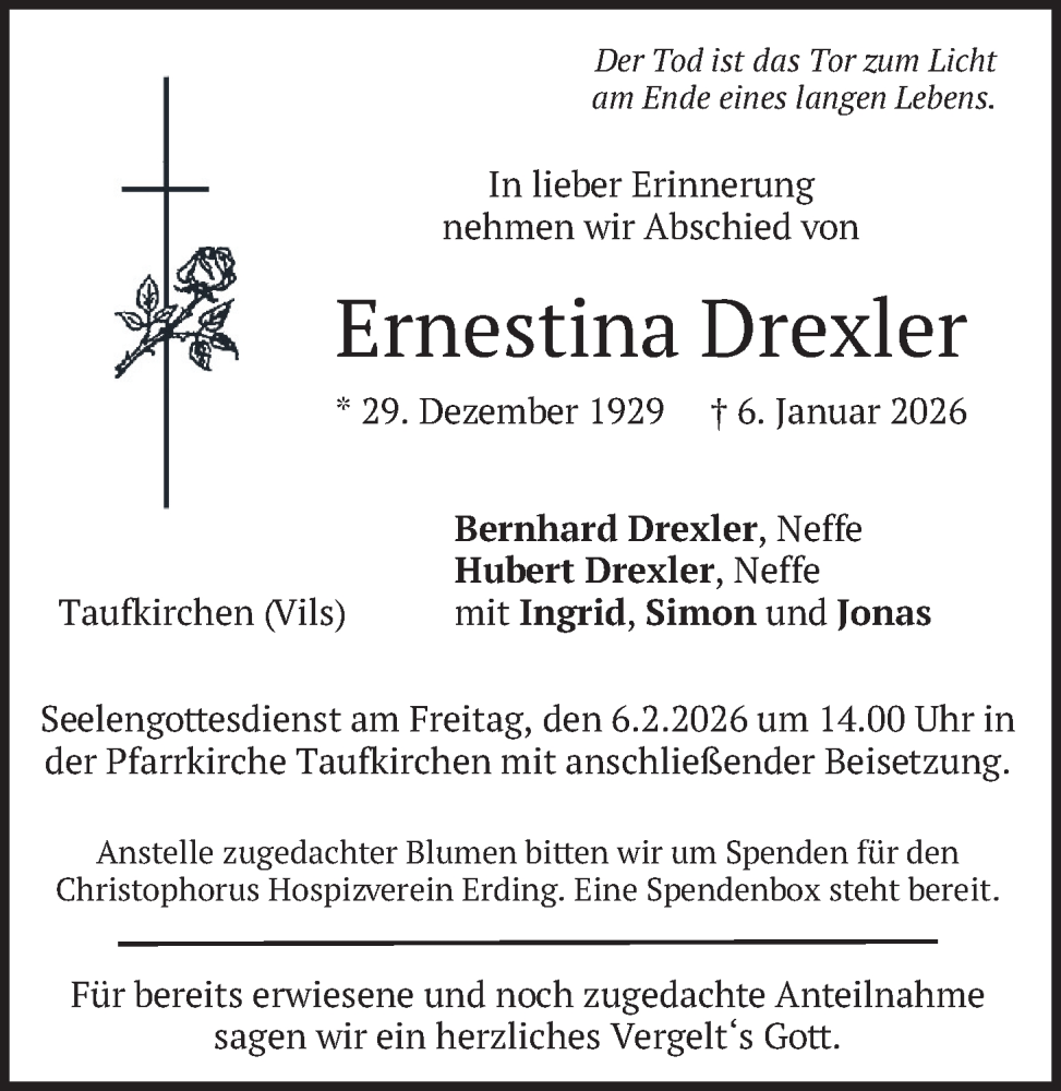 Hier finden Sie alle Traueranzeigen aus der Zeitung, die bisher für Ernestina Drexler erschienen sind. Weitere Traueranzeigen, die in der Zeitung erscheinen, werden hier ebenfalls aufgelistet