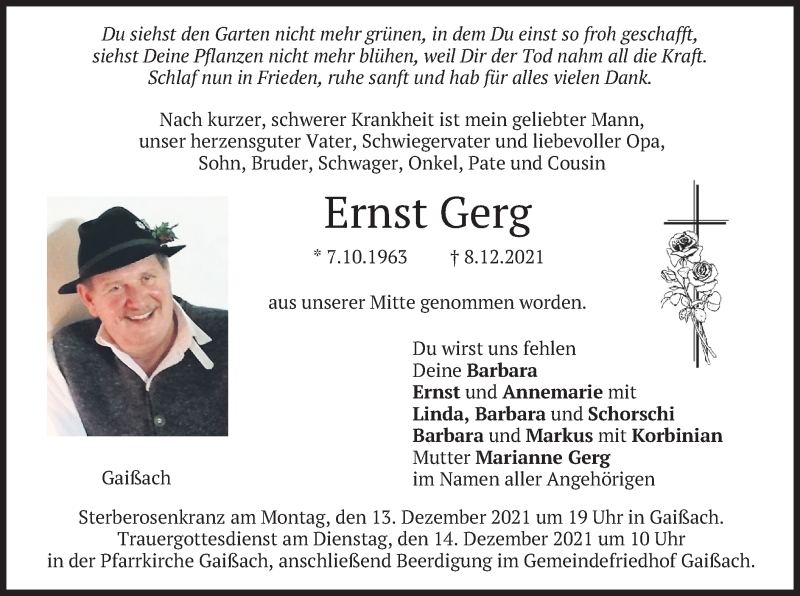Hier finden Sie alle Traueranzeigen aus der Zeitung, die bisher für Ernst Gerg erschienen sind. Weitere Traueranzeigen, die in der Zeitung erscheinen, werden hier ebenfalls aufgelistet