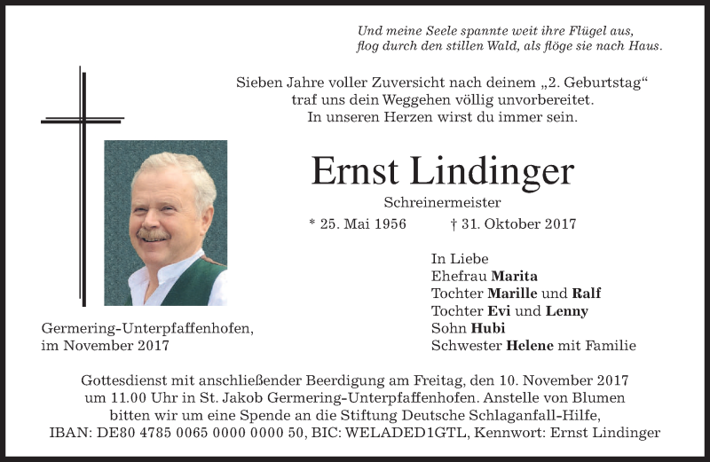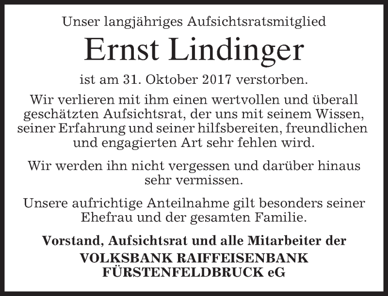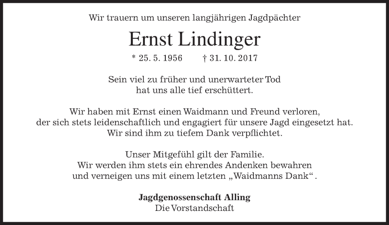 Hier finden Sie alle Traueranzeigen aus der Zeitung, die bisher für Ernst Lindinger erschienen sind. Weitere Traueranzeigen, die in der Zeitung erscheinen, werden hier ebenfalls aufgelistet