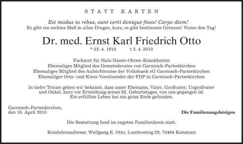 Hier finden Sie alle Traueranzeigen aus der Zeitung, die bisher für Ernst Karl Friedrich Otto erschienen sind. Weitere Traueranzeigen, die in der Zeitung erscheinen, werden hier ebenfalls aufgelistet
