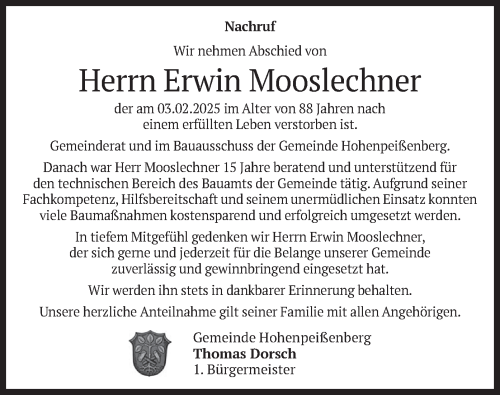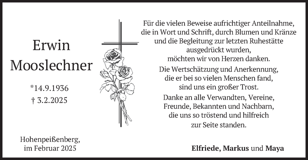 Hier finden Sie alle Traueranzeigen aus der Zeitung, die bisher für Erwin Mooslechner erschienen sind. Weitere Traueranzeigen, die in der Zeitung erscheinen, werden hier ebenfalls aufgelistet