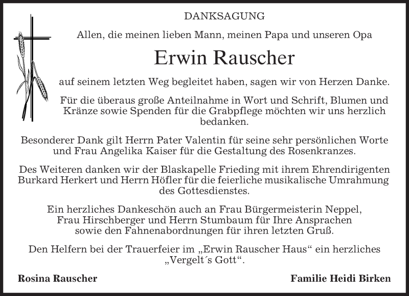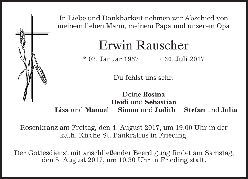 Hier finden Sie alle Traueranzeigen aus der Zeitung, die bisher für Erwin Rauscher erschienen sind. Weitere Traueranzeigen, die in der Zeitung erscheinen, werden hier ebenfalls aufgelistet