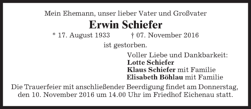 Hier finden Sie alle Traueranzeigen aus der Zeitung, die bisher für Erwin Schiefer erschienen sind. Weitere Traueranzeigen, die in der Zeitung erscheinen, werden hier ebenfalls aufgelistet
