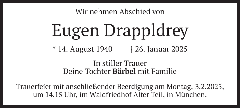 Hier finden Sie alle Traueranzeigen aus der Zeitung, die bisher für Eugen Drappldrey erschienen sind. Weitere Traueranzeigen, die in der Zeitung erscheinen, werden hier ebenfalls aufgelistet