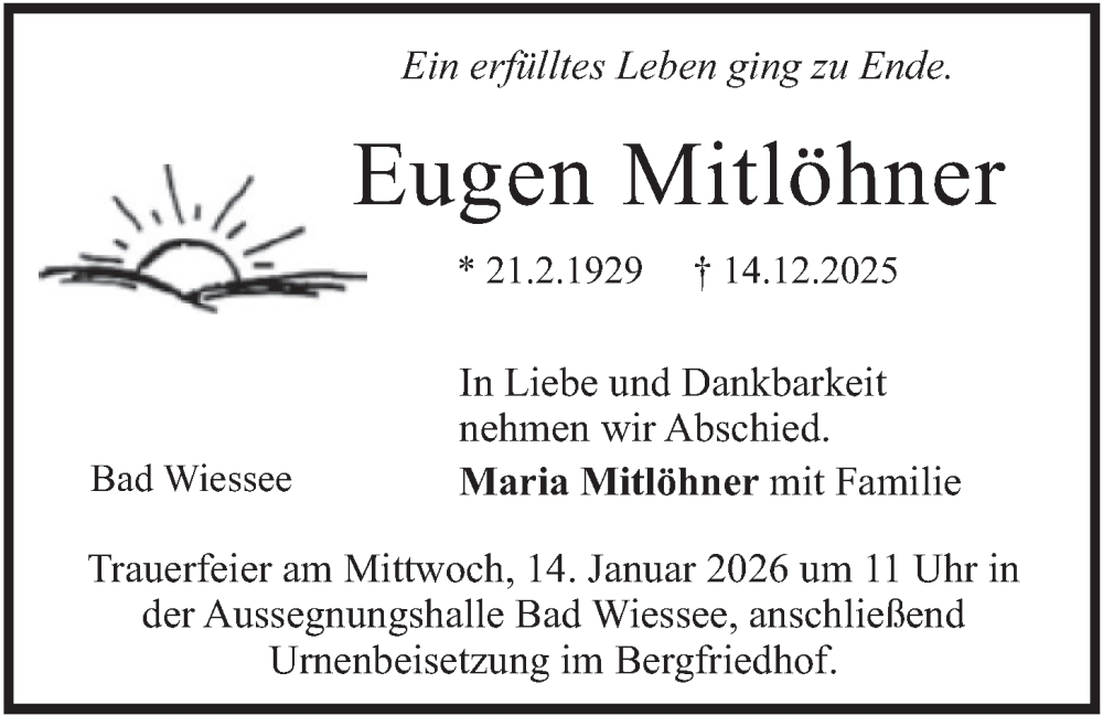 Hier finden Sie alle Traueranzeigen aus der Zeitung, die bisher für Eugen Mitlöhner erschienen sind. Weitere Traueranzeigen, die in der Zeitung erscheinen, werden hier ebenfalls aufgelistet