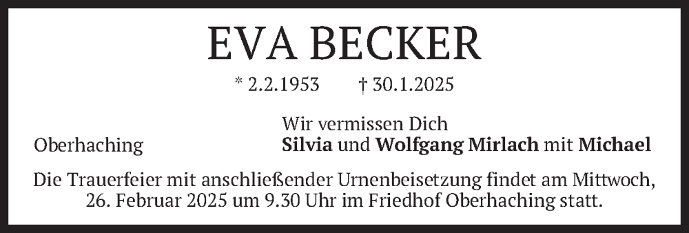 Hier finden Sie alle Traueranzeigen aus der Zeitung, die bisher für Eva Becker erschienen sind. Weitere Traueranzeigen, die in der Zeitung erscheinen, werden hier ebenfalls aufgelistet