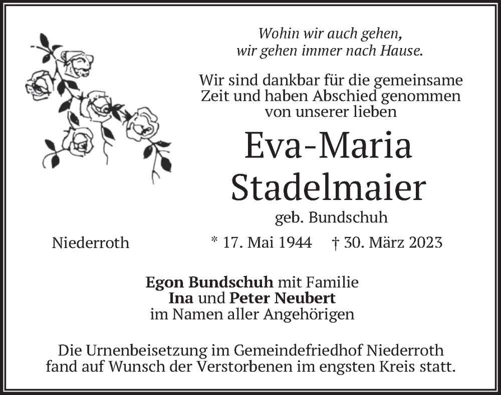 Hier finden Sie alle Traueranzeigen aus der Zeitung, die bisher für Eva-Maria Stadelmaier erschienen sind. Weitere Traueranzeigen, die in der Zeitung erscheinen, werden hier ebenfalls aufgelistet