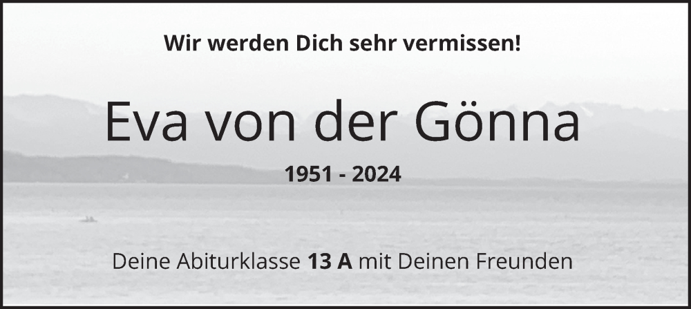 Hier finden Sie alle Traueranzeigen aus der Zeitung, die bisher für Eva von der Gönna erschienen sind. Weitere Traueranzeigen, die in der Zeitung erscheinen, werden hier ebenfalls aufgelistet