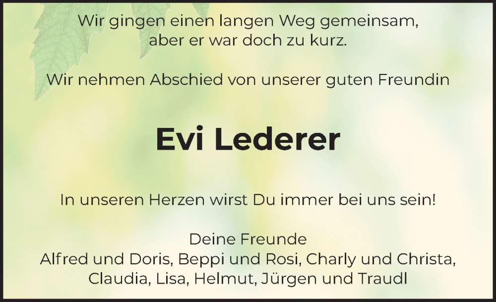 Hier finden Sie alle Traueranzeigen aus der Zeitung, die bisher für Evi Lederer erschienen sind. Weitere Traueranzeigen, die in der Zeitung erscheinen, werden hier ebenfalls aufgelistet