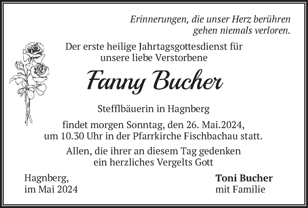 Hier finden Sie alle Traueranzeigen aus der Zeitung, die bisher für Fanny Bucher erschienen sind. Weitere Traueranzeigen, die in der Zeitung erscheinen, werden hier ebenfalls aufgelistet
