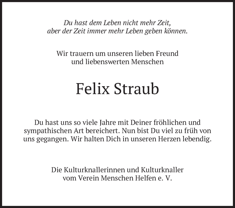 Hier finden Sie alle Traueranzeigen aus der Zeitung, die bisher für Felix Straub erschienen sind. Weitere Traueranzeigen, die in der Zeitung erscheinen, werden hier ebenfalls aufgelistet