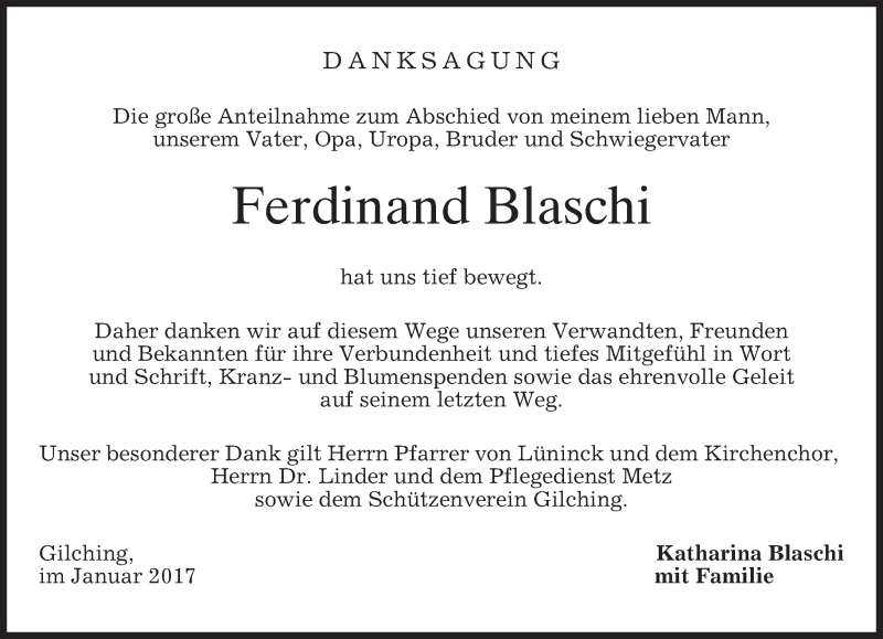 Hier finden Sie alle Traueranzeigen aus der Zeitung, die bisher für Ferdinand Blaschi erschienen sind. Weitere Traueranzeigen, die in der Zeitung erscheinen, werden hier ebenfalls aufgelistet