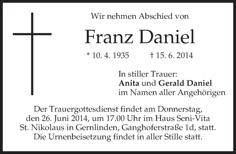 Hier finden Sie alle Traueranzeigen aus der Zeitung, die bisher für Franz Daniel erschienen sind. Weitere Traueranzeigen, die in der Zeitung erscheinen, werden hier ebenfalls aufgelistet