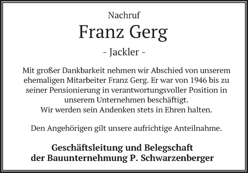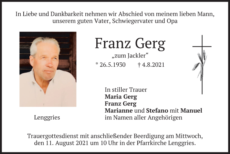 Hier finden Sie alle Traueranzeigen aus der Zeitung, die bisher für Franz Gerg erschienen sind. Weitere Traueranzeigen, die in der Zeitung erscheinen, werden hier ebenfalls aufgelistet