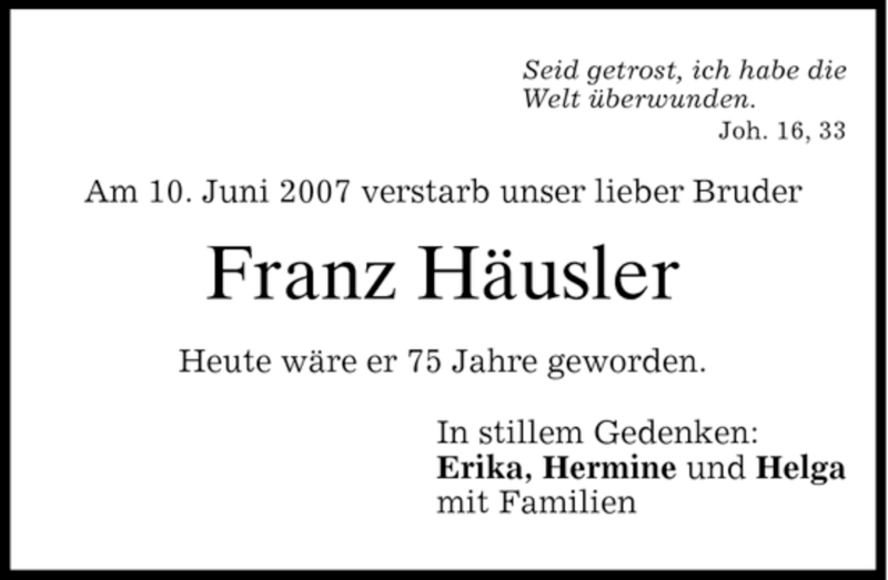Hier finden Sie alle Traueranzeigen aus der Zeitung, die bisher für Franz Häusler erschienen sind. Weitere Traueranzeigen, die in der Zeitung erscheinen, werden hier ebenfalls aufgelistet