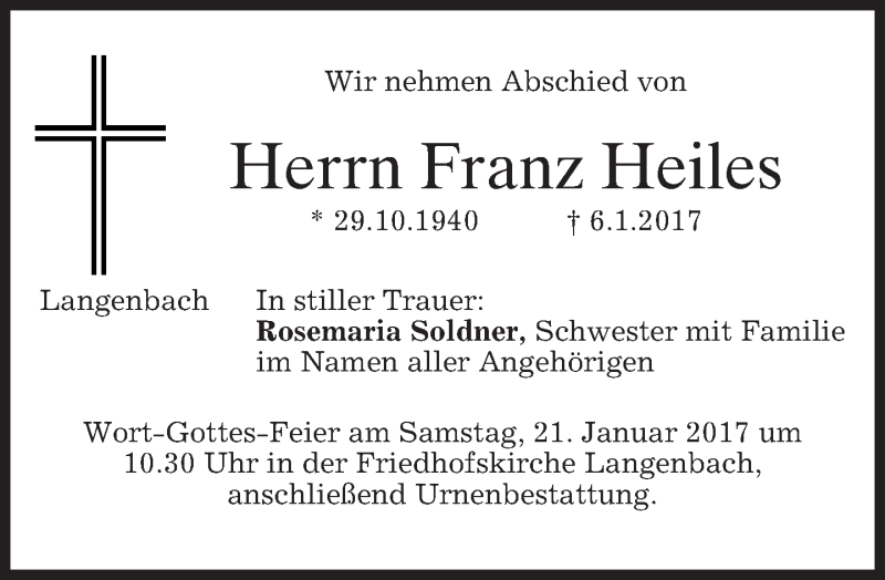 Hier finden Sie alle Traueranzeigen aus der Zeitung, die bisher für Franz Heiles erschienen sind. Weitere Traueranzeigen, die in der Zeitung erscheinen, werden hier ebenfalls aufgelistet