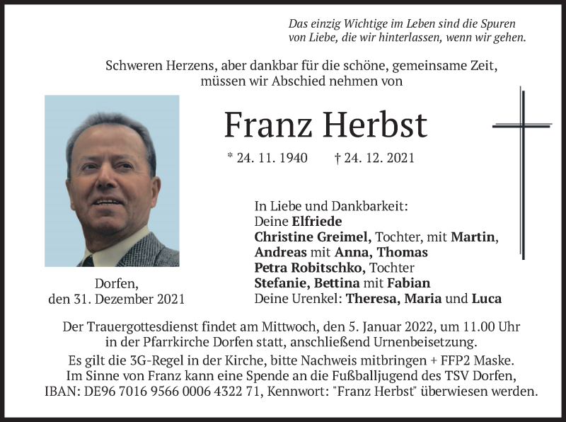 Hier finden Sie alle Traueranzeigen aus der Zeitung, die bisher für Franz Herbst erschienen sind. Weitere Traueranzeigen, die in der Zeitung erscheinen, werden hier ebenfalls aufgelistet