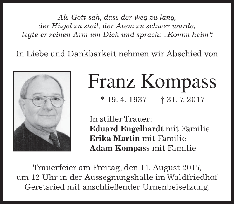 Hier finden Sie alle Traueranzeigen aus der Zeitung, die bisher für Franz Kompass erschienen sind. Weitere Traueranzeigen, die in der Zeitung erscheinen, werden hier ebenfalls aufgelistet