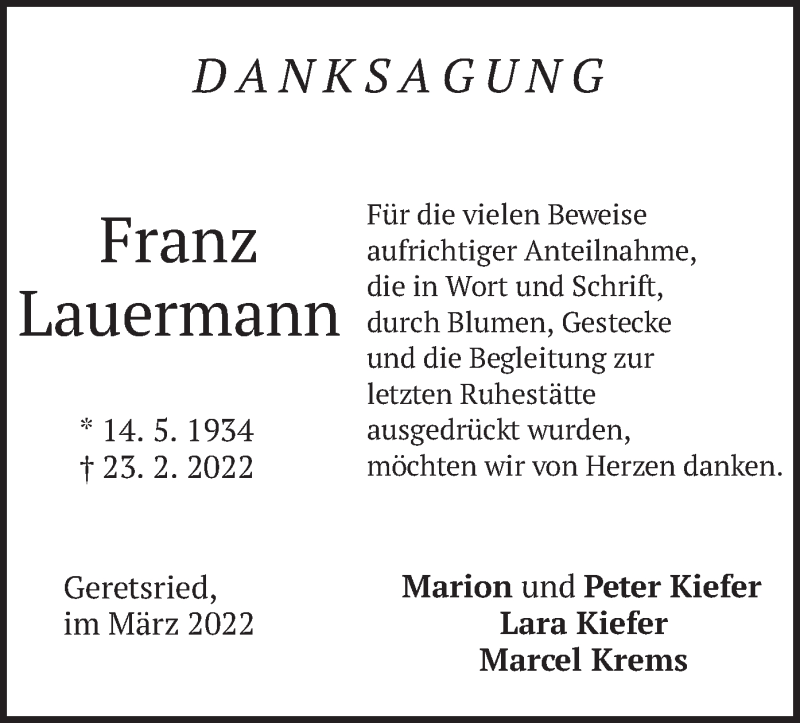 Hier finden Sie alle Traueranzeigen aus der Zeitung, die bisher für Franz Lauermann erschienen sind. Weitere Traueranzeigen, die in der Zeitung erscheinen, werden hier ebenfalls aufgelistet