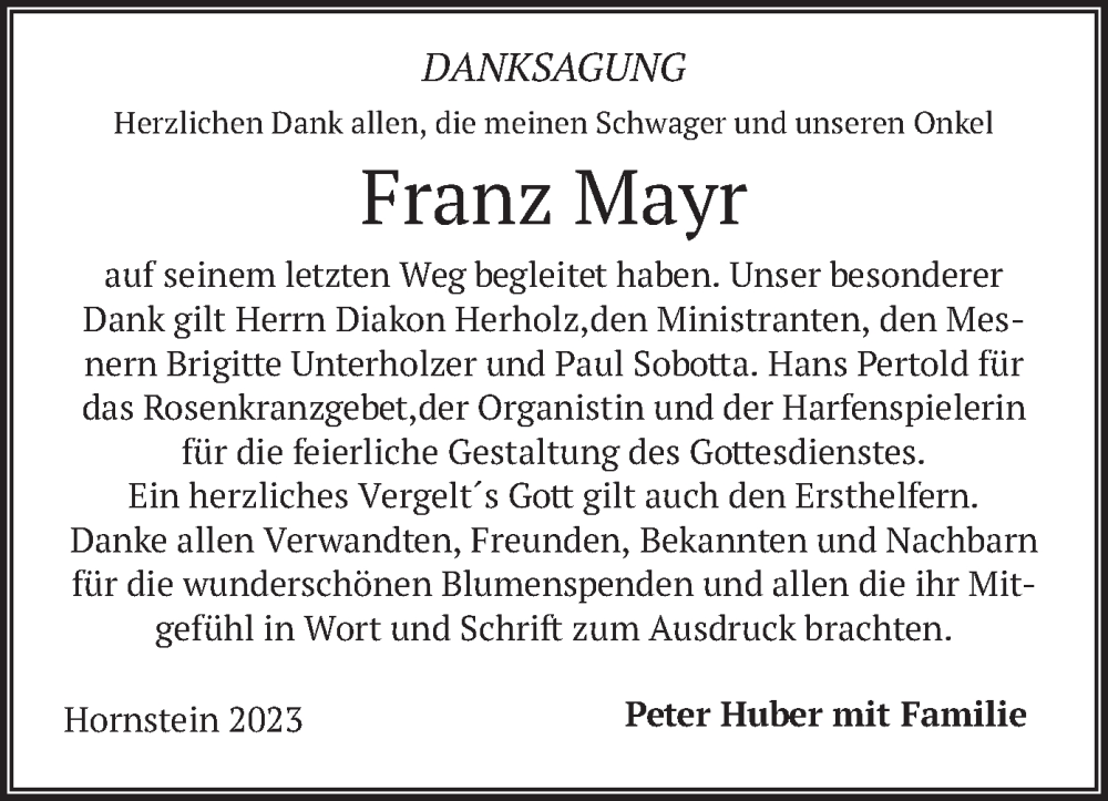 Hier finden Sie alle Traueranzeigen aus der Zeitung, die bisher für Franz Mayr erschienen sind. Weitere Traueranzeigen, die in der Zeitung erscheinen, werden hier ebenfalls aufgelistet