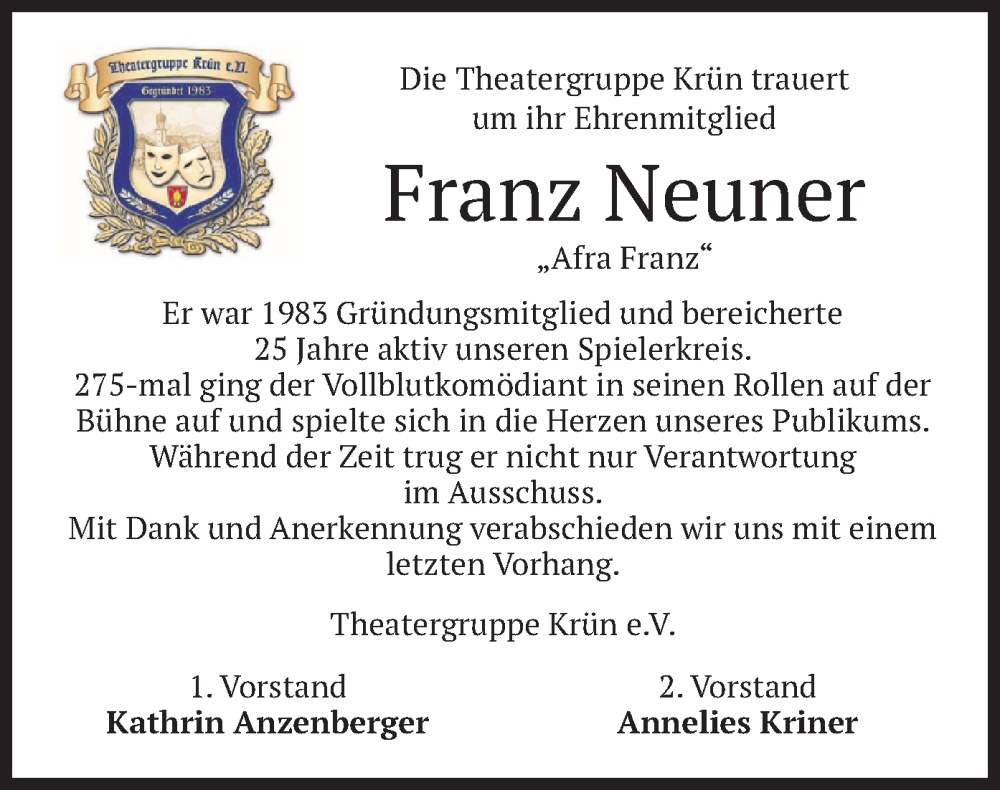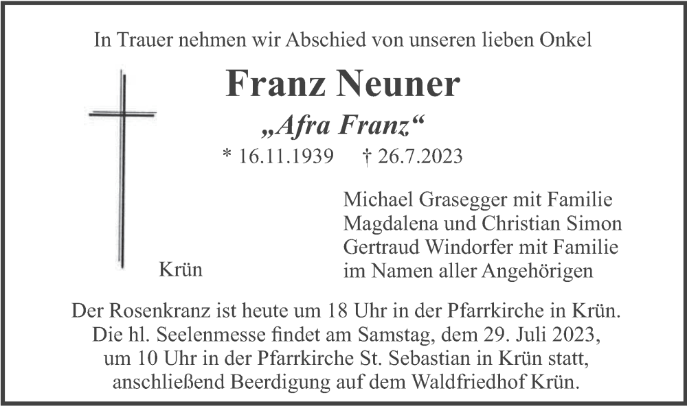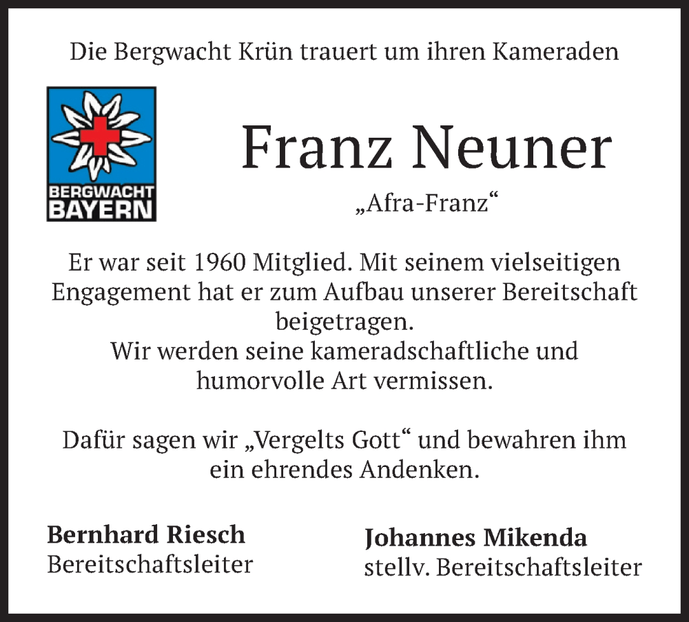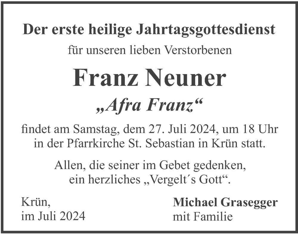Hier finden Sie alle Traueranzeigen aus der Zeitung, die bisher für Franz Neuner erschienen sind. Weitere Traueranzeigen, die in der Zeitung erscheinen, werden hier ebenfalls aufgelistet