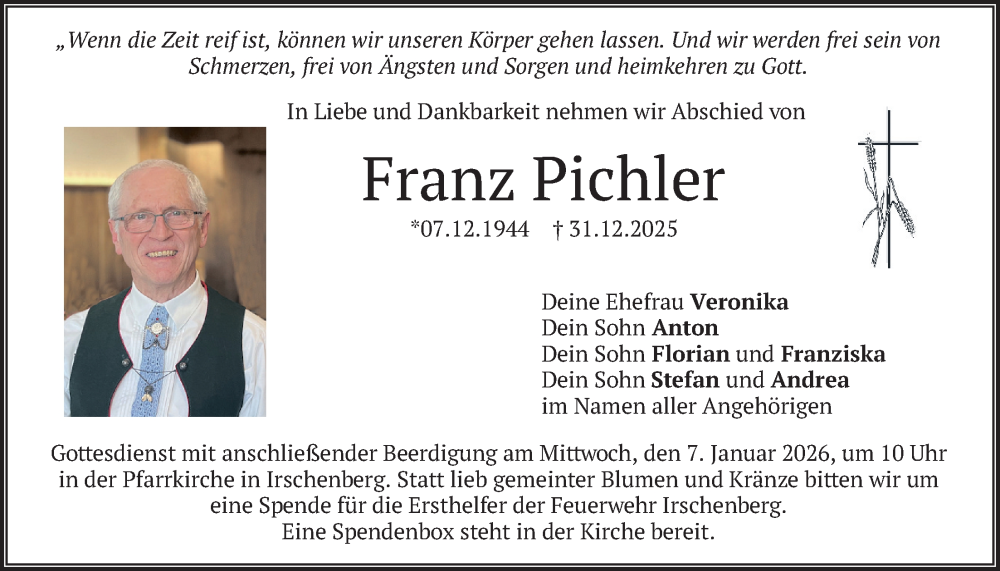 Hier finden Sie alle Traueranzeigen aus der Zeitung, die bisher für Franz Pichler erschienen sind. Weitere Traueranzeigen, die in der Zeitung erscheinen, werden hier ebenfalls aufgelistet
