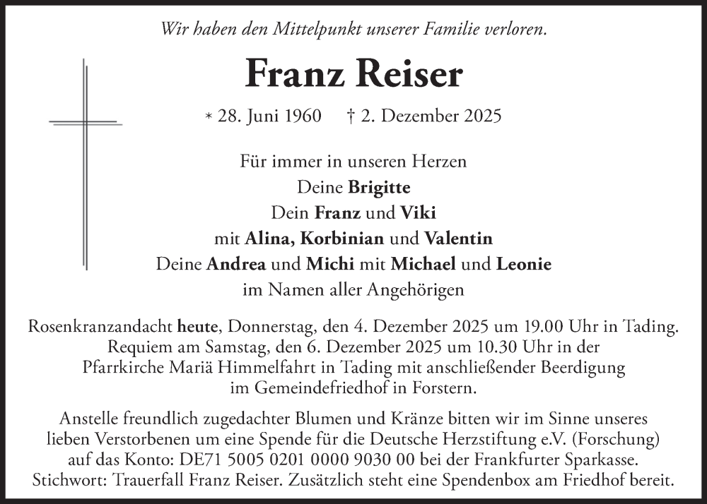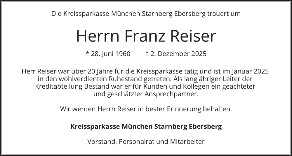 Hier finden Sie alle Traueranzeigen aus der Zeitung, die bisher für Franz Reiser erschienen sind. Weitere Traueranzeigen, die in der Zeitung erscheinen, werden hier ebenfalls aufgelistet