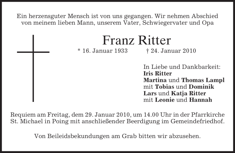 Hier finden Sie alle Traueranzeigen aus der Zeitung, die bisher für Franz Ritter erschienen sind. Weitere Traueranzeigen, die in der Zeitung erscheinen, werden hier ebenfalls aufgelistet