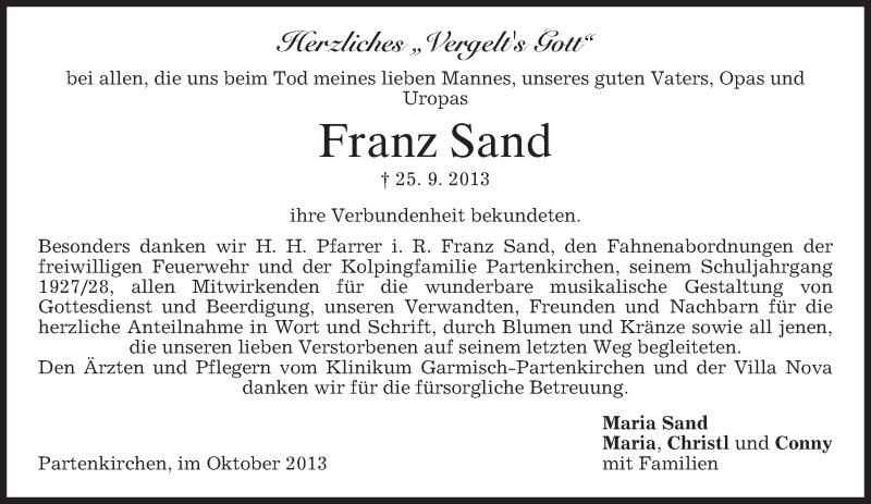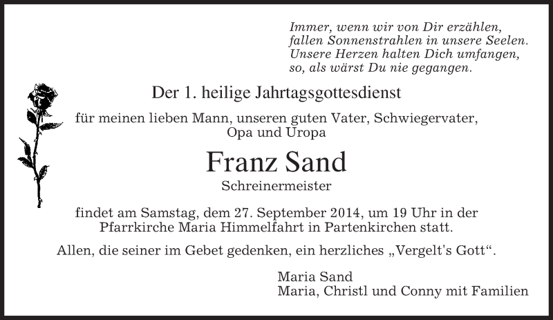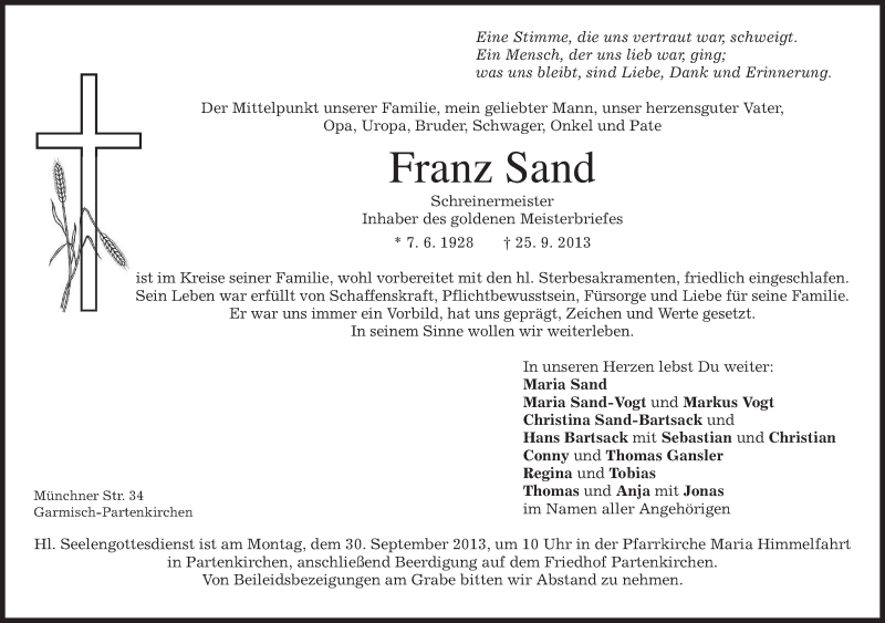 Hier finden Sie alle Traueranzeigen aus der Zeitung, die bisher für Franz Sand erschienen sind. Weitere Traueranzeigen, die in der Zeitung erscheinen, werden hier ebenfalls aufgelistet