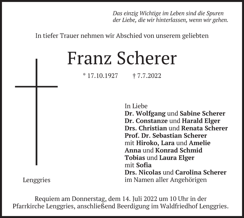 Hier finden Sie alle Traueranzeigen aus der Zeitung, die bisher für Franz Scherer erschienen sind. Weitere Traueranzeigen, die in der Zeitung erscheinen, werden hier ebenfalls aufgelistet