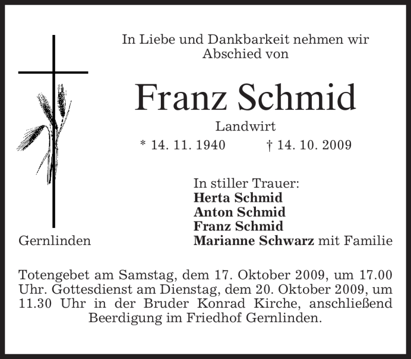 Hier finden Sie alle Traueranzeigen aus der Zeitung, die bisher für Franz Schmid erschienen sind. Weitere Traueranzeigen, die in der Zeitung erscheinen, werden hier ebenfalls aufgelistet