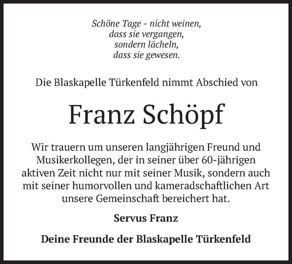 Hier finden Sie alle Traueranzeigen aus der Zeitung, die bisher für Franz Schöpf erschienen sind. Weitere Traueranzeigen, die in der Zeitung erscheinen, werden hier ebenfalls aufgelistet