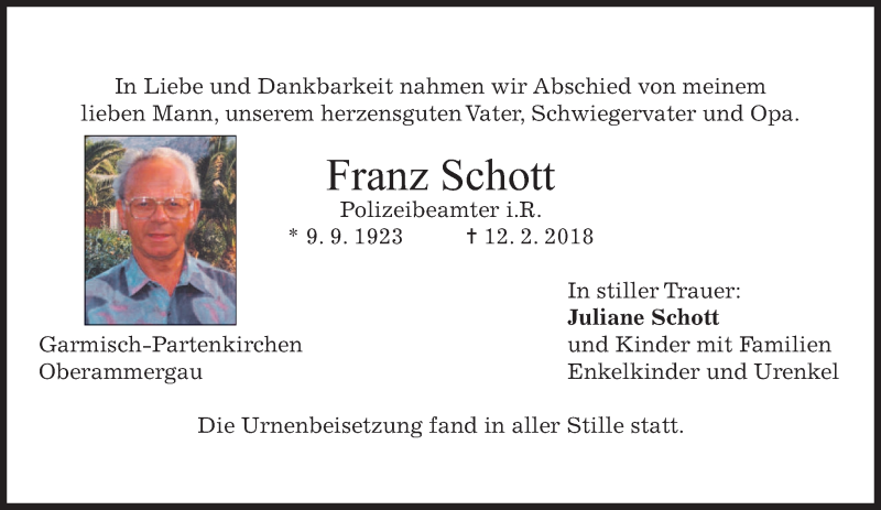 Hier finden Sie alle Traueranzeigen aus der Zeitung, die bisher für Franz Schott erschienen sind. Weitere Traueranzeigen, die in der Zeitung erscheinen, werden hier ebenfalls aufgelistet