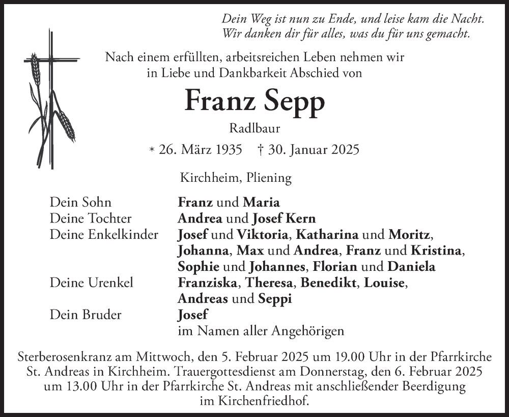 Hier finden Sie alle Traueranzeigen aus der Zeitung, die bisher für Franz Sepp erschienen sind. Weitere Traueranzeigen, die in der Zeitung erscheinen, werden hier ebenfalls aufgelistet