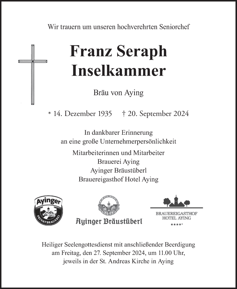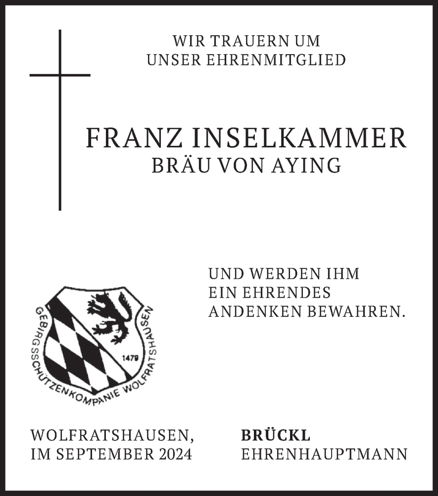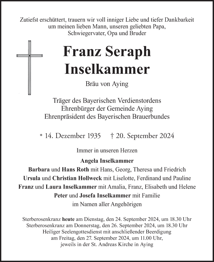 Hier finden Sie alle Traueranzeigen aus der Zeitung, die bisher für Franz Seraph Inselkammer erschienen sind. Weitere Traueranzeigen, die in der Zeitung erscheinen, werden hier ebenfalls aufgelistet