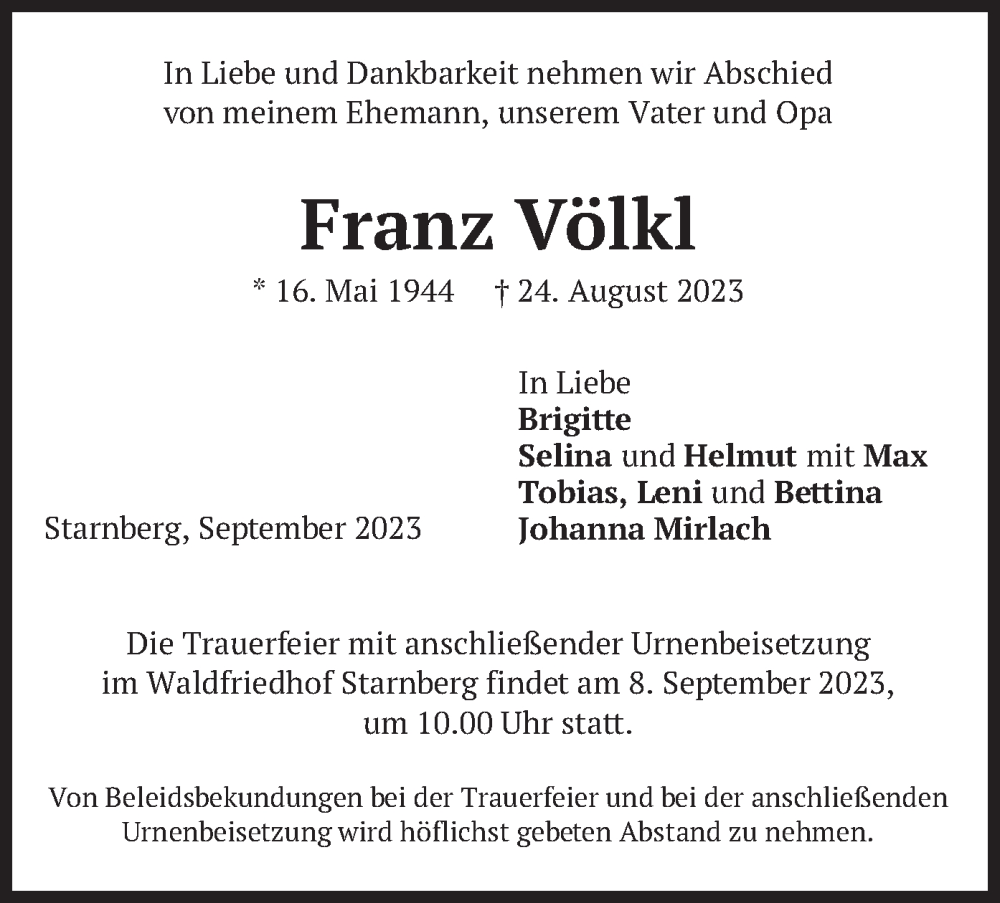 Hier finden Sie alle Traueranzeigen aus der Zeitung, die bisher für Franz Völkl erschienen sind. Weitere Traueranzeigen, die in der Zeitung erscheinen, werden hier ebenfalls aufgelistet
